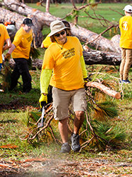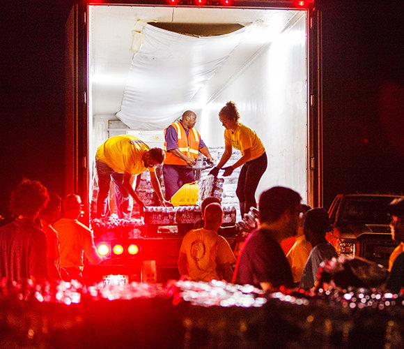 志願牧師帶著鏈鋸走過城鎮,鋸下搖搖欲墜的樹木。 其他人設置物資發放中心,在此發放飲水、清潔衛生用品,以及照顧寶寶的物品。