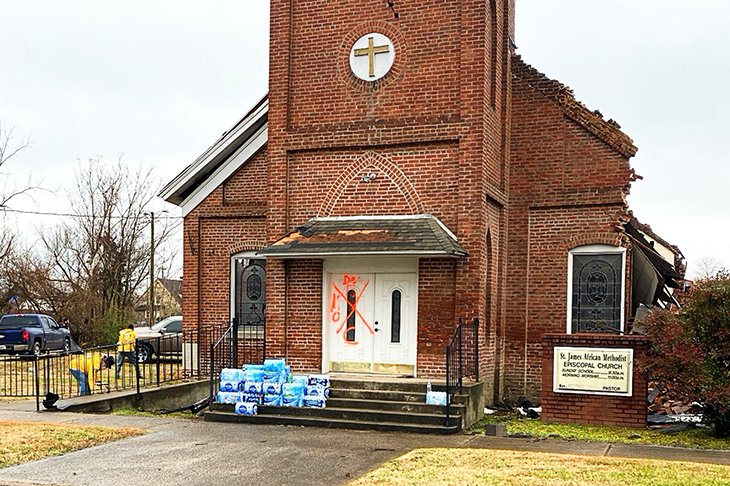 一輛U-Haul貨車上載滿一百台發電機、暖氣機和瓦斯罐,來到肯塔基州的梅菲爾德,就在第八街跟核桃街的交叉口,搭設亮黃色的帳篷。 志願牧師協助卸下卡車上珍貴的物資,並發送出兩千九百份熱騰騰的餐點,讓災民們有回到家的感覺。